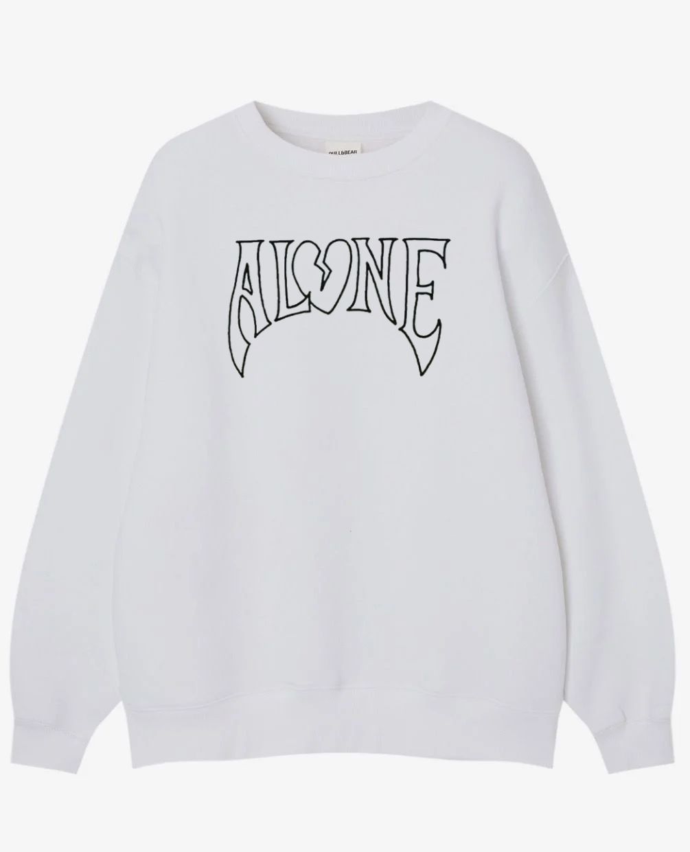This look features a distinctive graphic on the front that spells out "ALONE" in a unique, curved font. The design incorporates a broken heart motif, with a crack running through the letter 'O'. The text has a subtle, almost distressed look, giving it a vintage or worn-in feel. This look is perfect for staying comfortable while making a quiet statement. Whether you're feeling pensive or just love the aesthetic, the "Alone" hoodie is a powerful addition to any wardrobe.