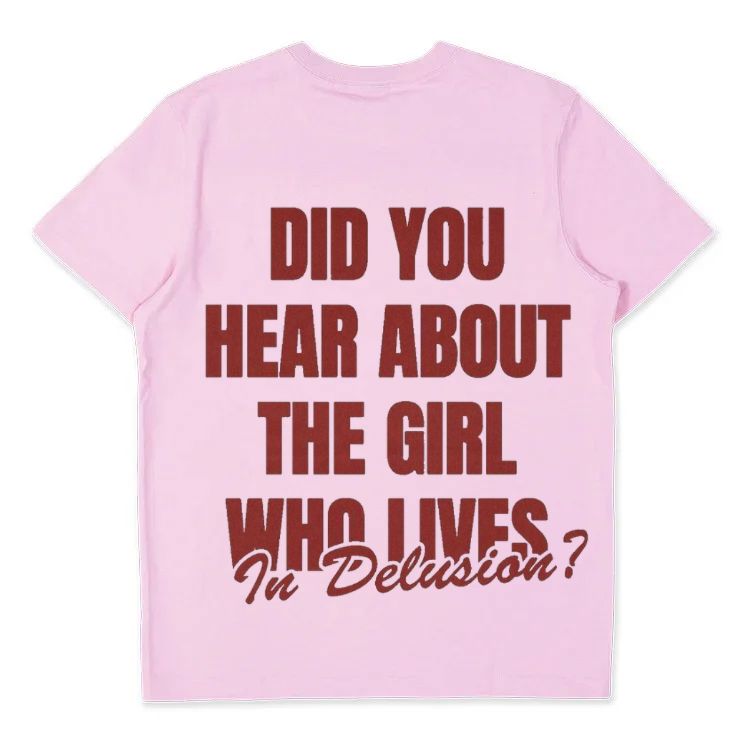 Dare to wear your mind. This bold look features a striking graphic on the back that reads, "DID YOU HEAR ABOUT THE GIRL WHO LIVES In Delusion?" in a textured font. It's a statement piece that sparks curiosity and conversation, perfect for those who embrace their unique perspective and aren't afraid to stand out.