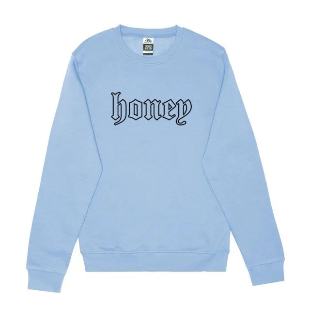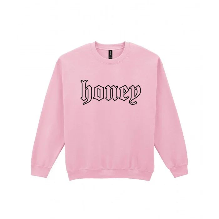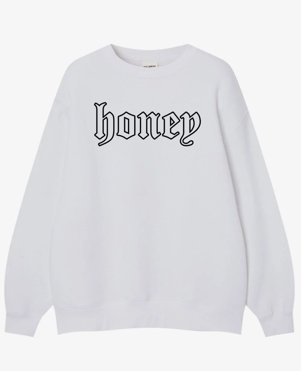 Elevate your casual wardrobe with this statement look featuring the word "honey" printed across the chest in a striking gothic script.