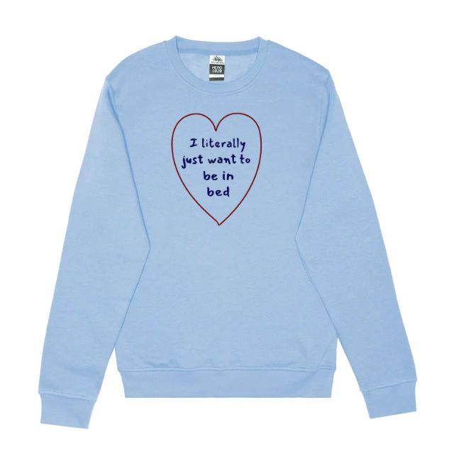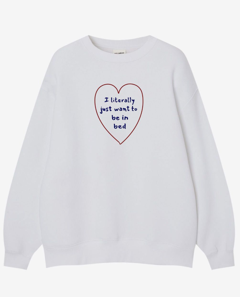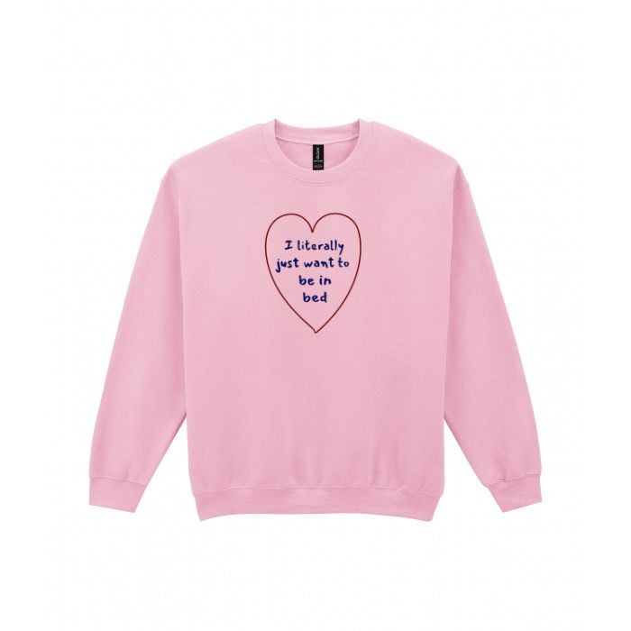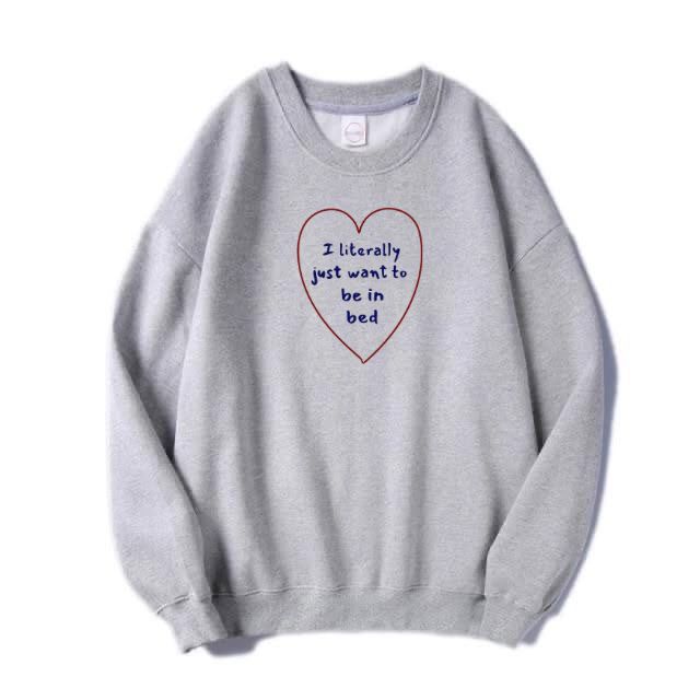 This look is perfect for those days when all you want to do is relax. The look is ideal for lounging at home, running errands, or just kicking back. The heart-shaped graphic on the front features the relatable phrase "I literally just want to be in bed," adding a touch of humour and personality to your casual wear.