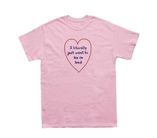 This look is perfect for those days when all you want to do is relax. The look is ideal for lounging at home, running errands, or just kicking back. The heart-shaped graphic on the front features the relatable phrase "I literally just want to be in bed," adding a touch of humour and personality to your casual wear.