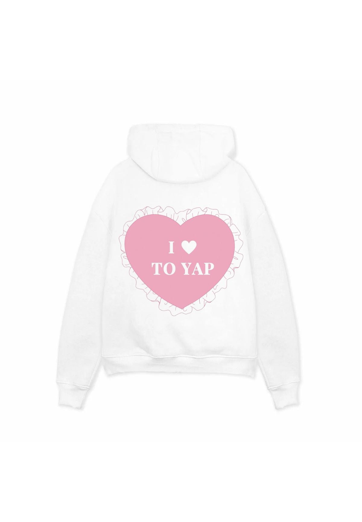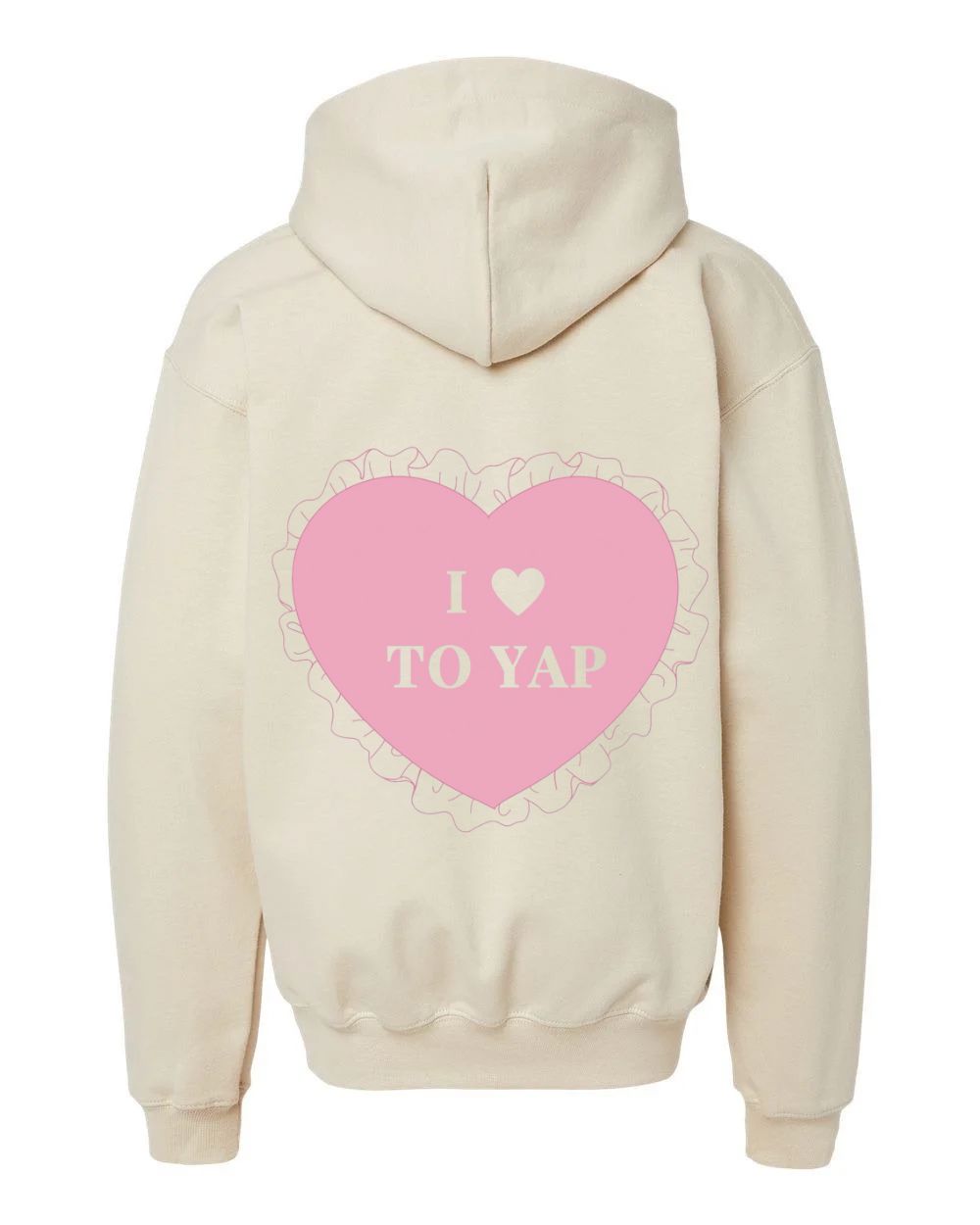 A pink frilly heart wrapped around “I ?? TO YAP.” Loud, proud, and group chat certified.