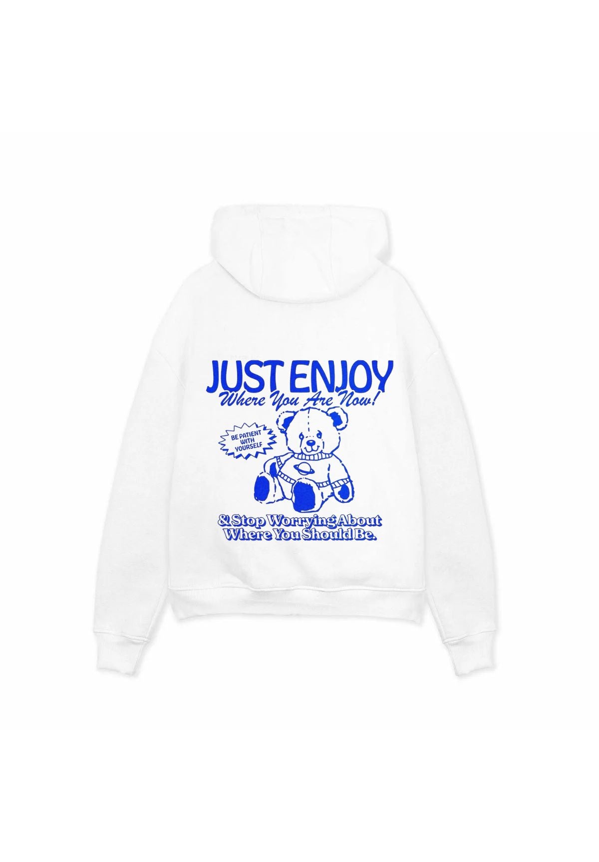 A teddy bear with big wisdom energy says: relax, you're doing fine. A gentle blue graphic reminding us that presence is the real destination.