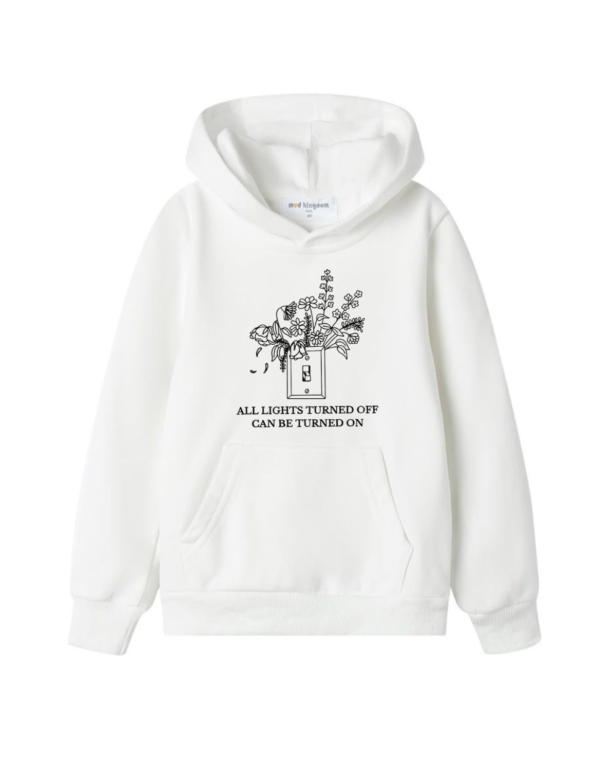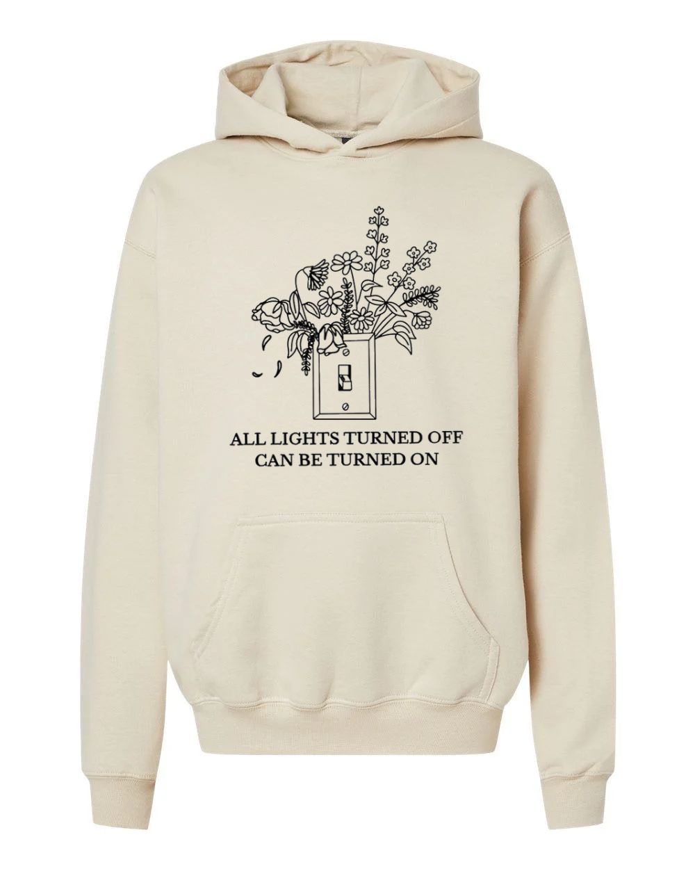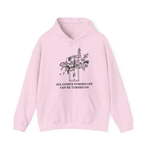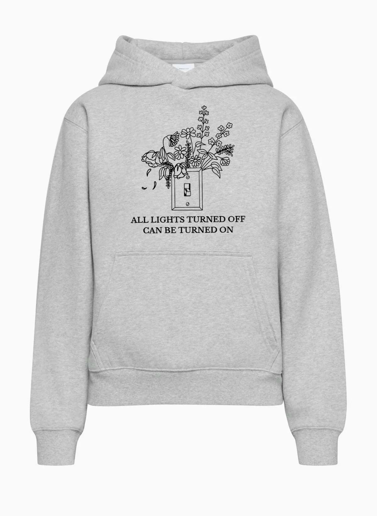 A hopeful message paired with blooming flowers from a light switch. Wear it when you need a reminder that even dark times can be flipped around.