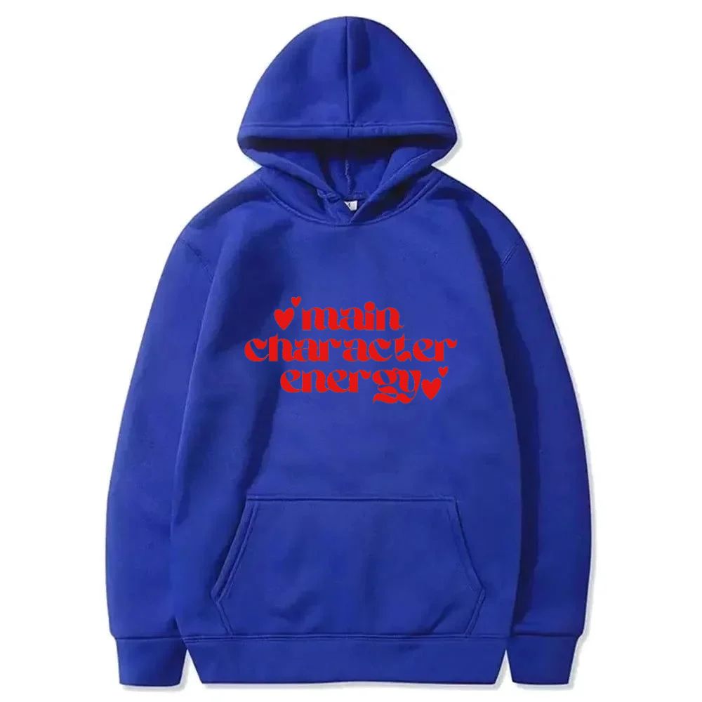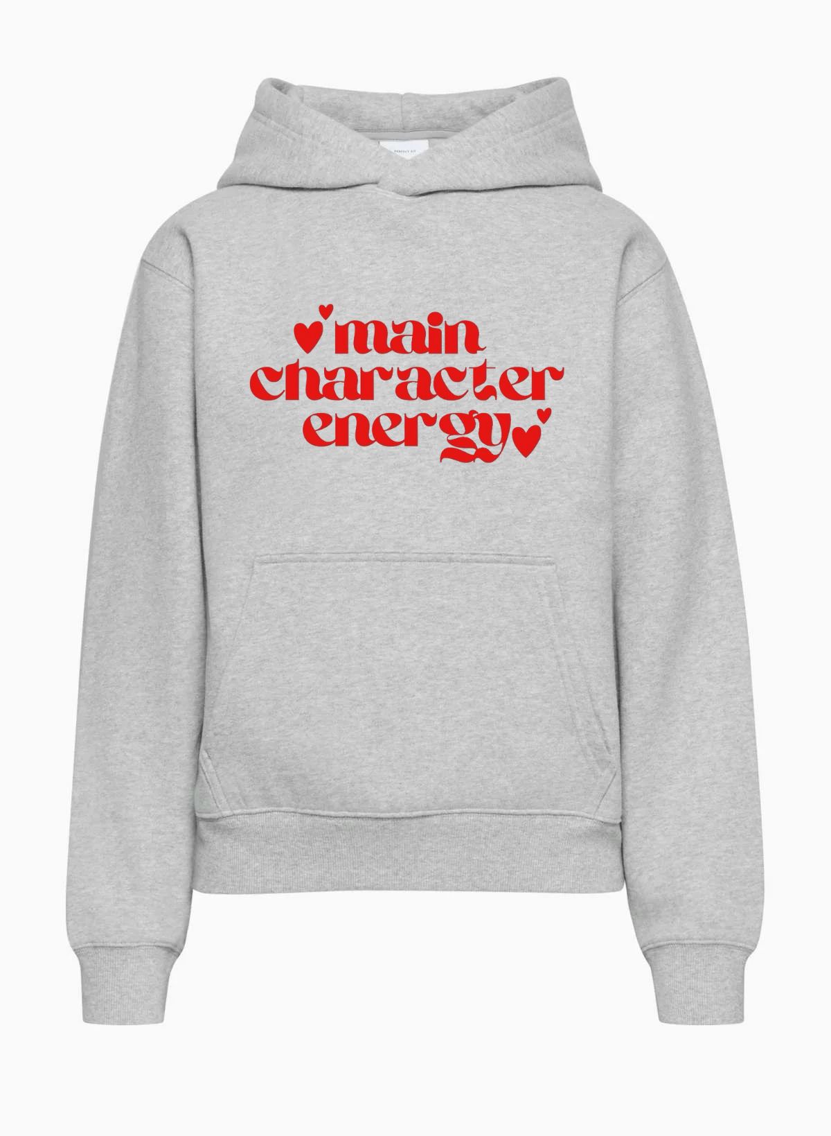 Step into your starring role with this bold look, designed for those who know they're the main event. Featuring a striking, vibrant red graphic that reads "main character energy" in a cool, slightly gothic-inspired font, this look is an instant statement piece. Little red hearts surround the text, adding a charming, confident flair.