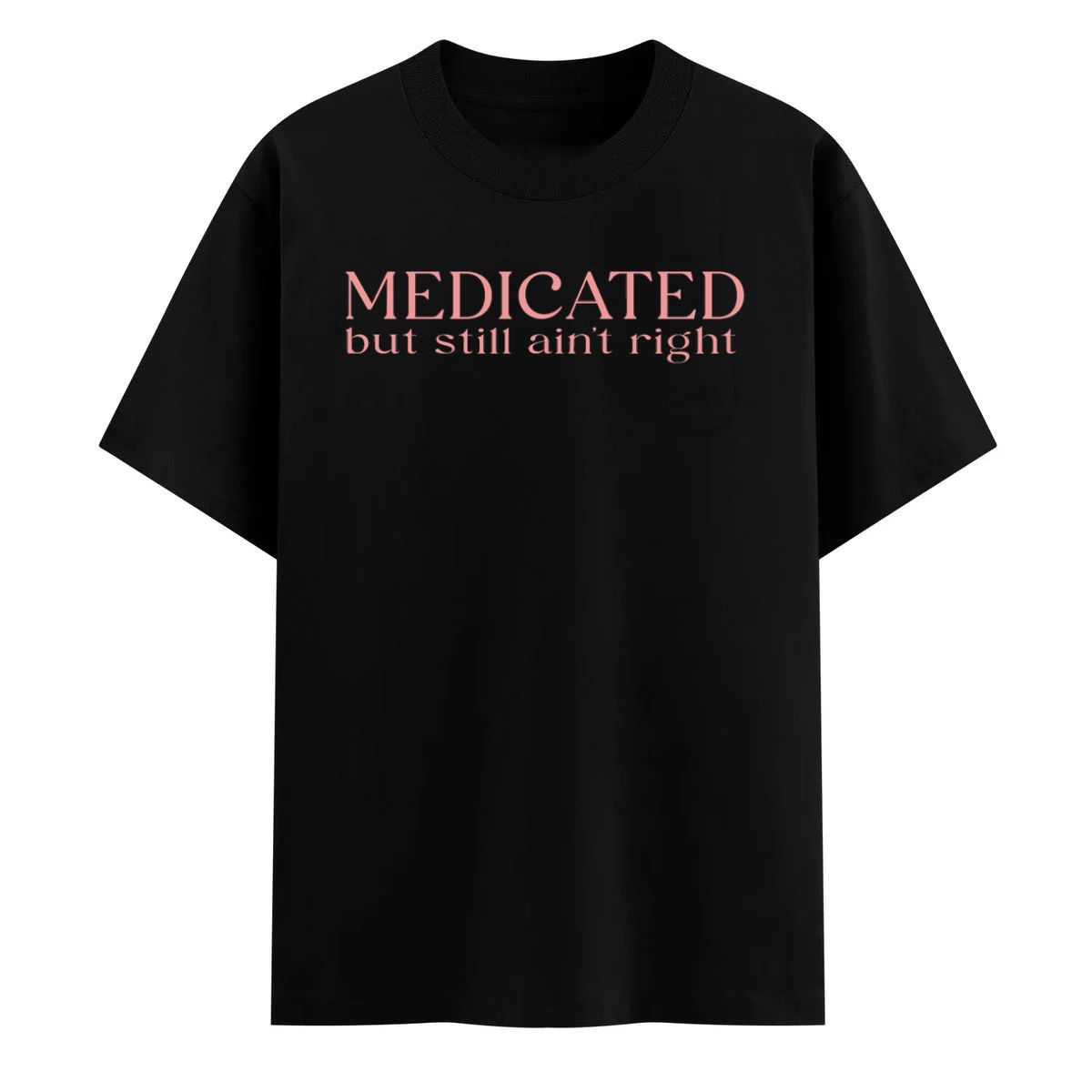 This look offers a touch of relatable humour. It features the phrase "MEDICATED but still ain't right" making a lighthearted statement. This look is designed for those days when you need a bit of comfort and a laugh. It's an honest and amusing addition to your casual wardrobe.