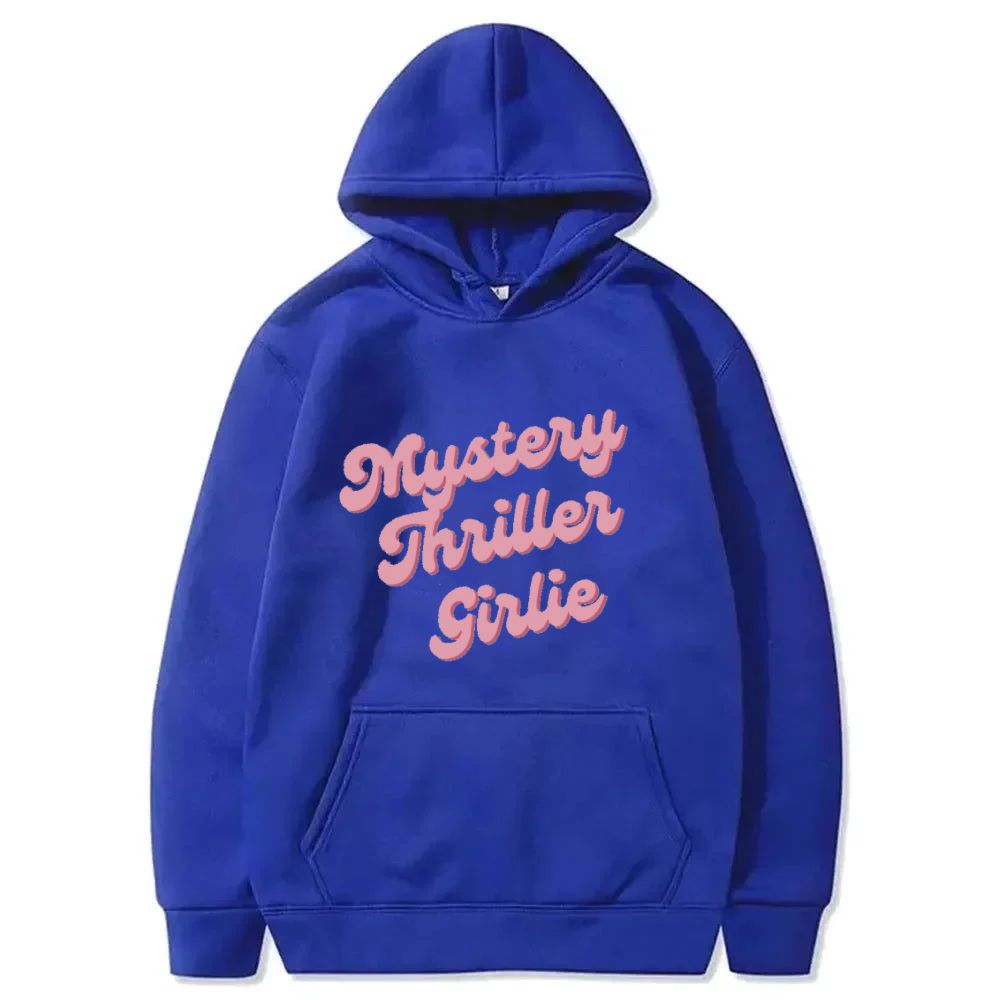 Calling all crime junkies, true-crime enthusiasts, and bookworms who prefer a plot twist! Snuggle up for your next late-night read or binge-watching session with this comfy look that proudly declares your love for all things suspenseful. Featuring the phrase "Mystery Thriller Girlie" in a fun, bold, retro-inspired pink font, this look is the perfect way to let the world know what you're obsessing over.