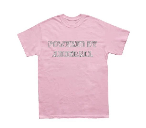 This design features the bold statement "POWERED BY ADDERALL" emblazoned across the chest in a classic collegiate font. Perfect for everyday wear, offering both style and a touch of edgy humour.