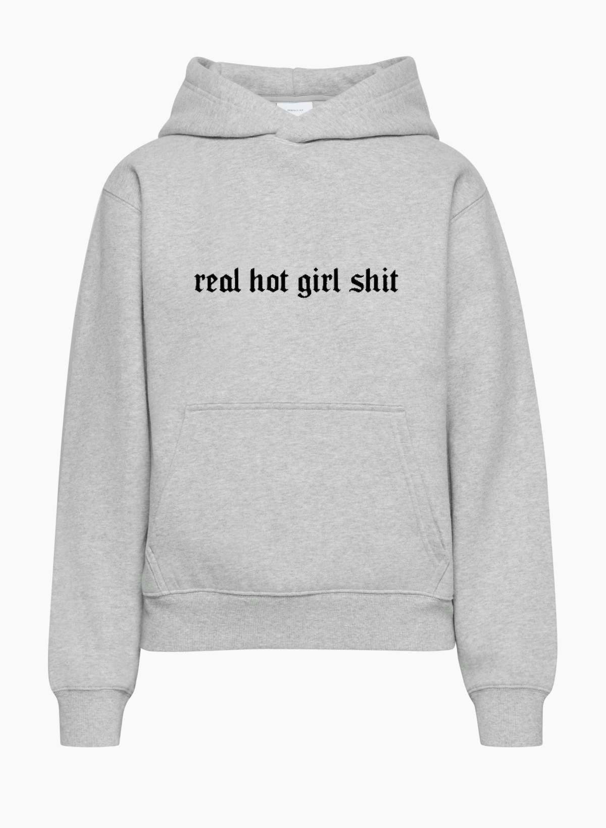 Own your confidence and make a statement with this effortlessly cool design. Featuring the popular phrase "real hot girl shit" printed across the chest in a distinct, gothic-style font, this piece is all about embracing your inner power and unapologetic energy.