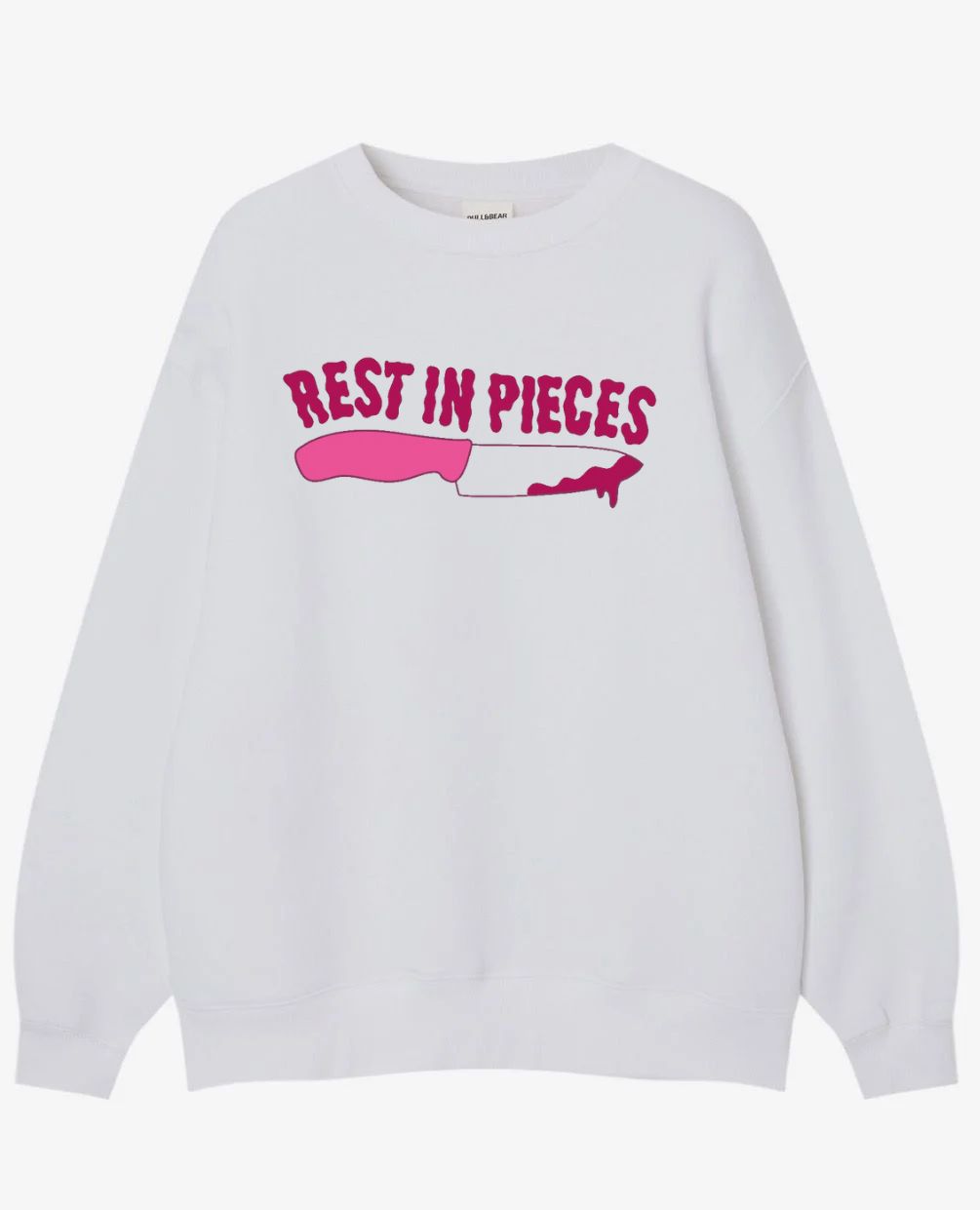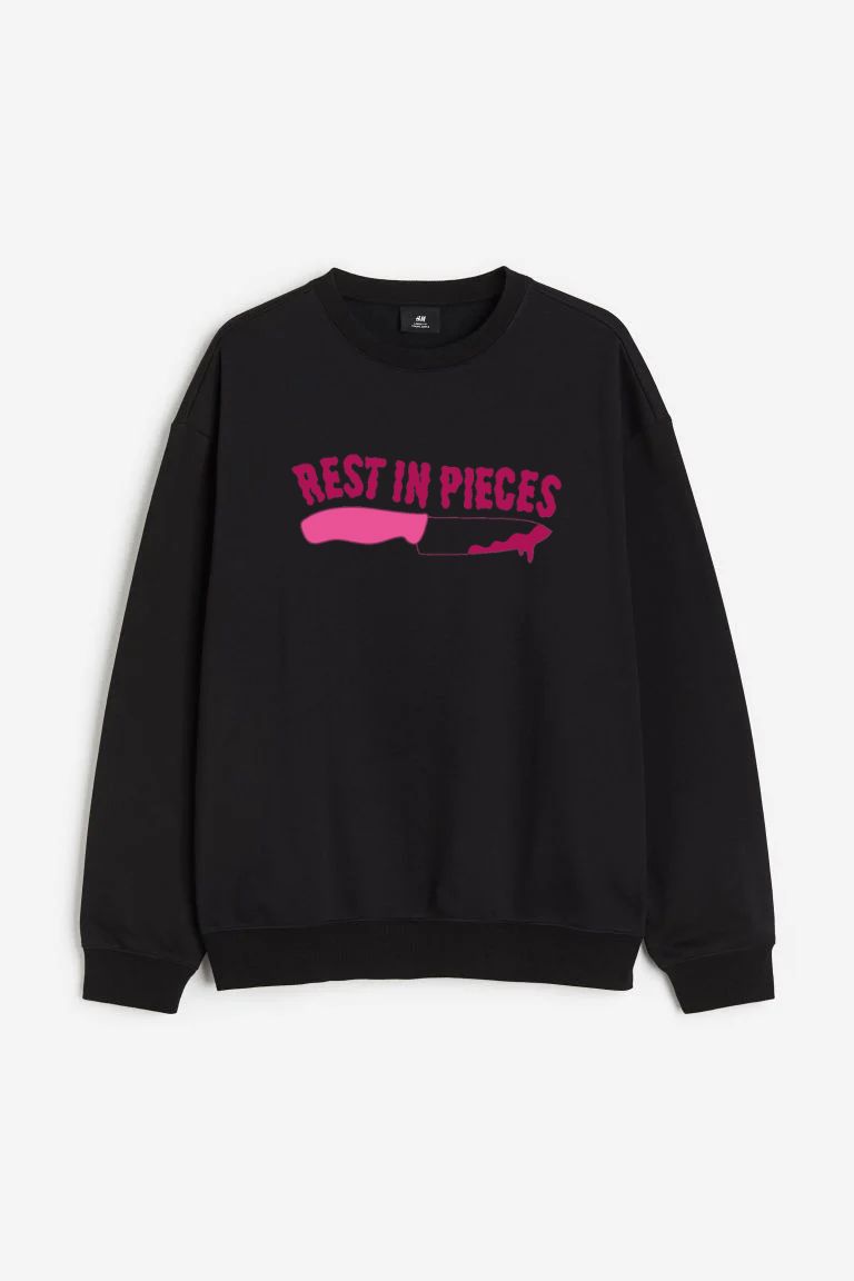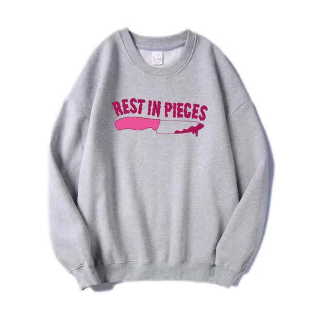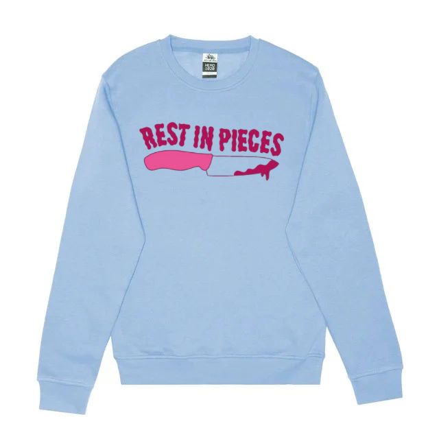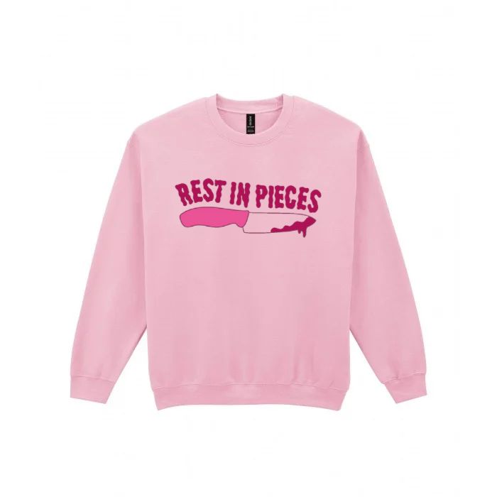 Dare to wear your dark side with this "Rest In Pieces" Slasher Design. Perfect for horror fans, true crime aficionados, or anyone who just loves a darkly humorous twist, this look makes a bold, unforgettable statement. The shocking hot-pink graphic features the phrase "REST IN PIECES" above a bloody knife illustration, dripped in gore. It’s the ultimate combination of unsettling and stylish.