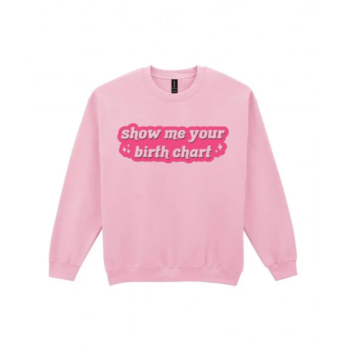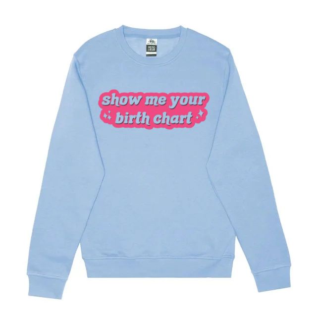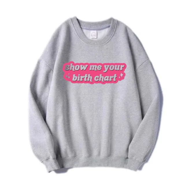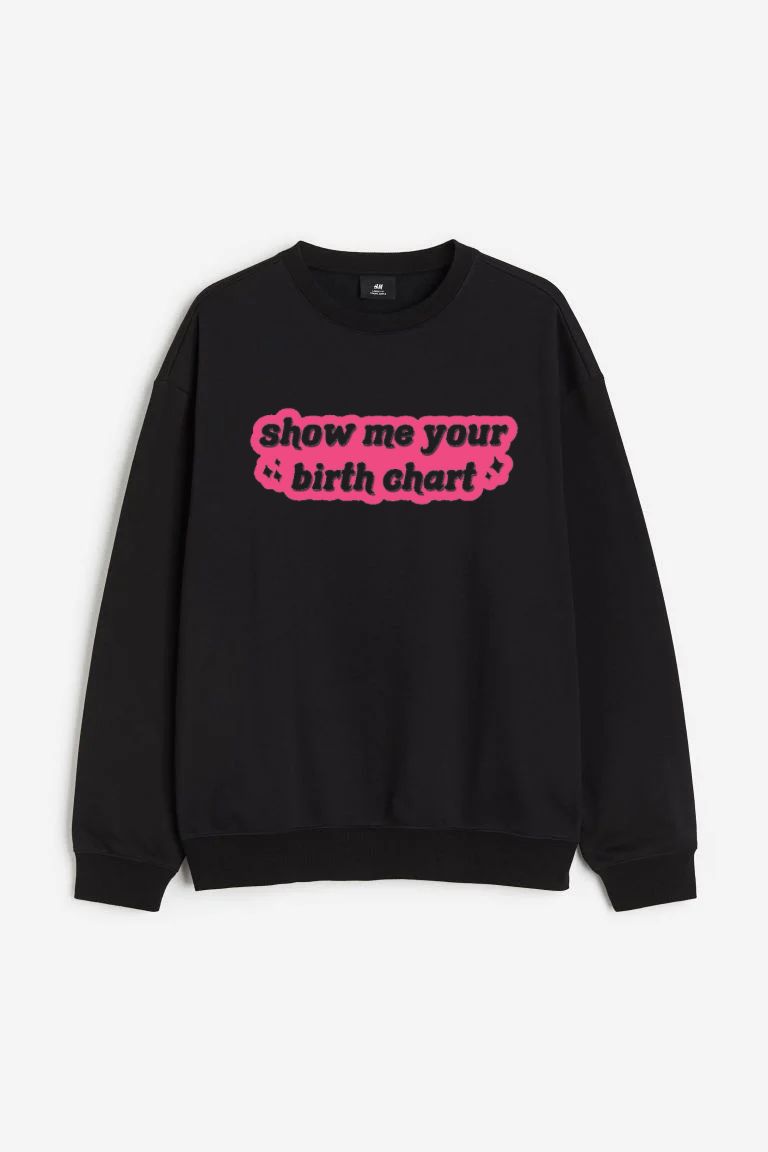 Declare your love for all things astrological with this statement-making look! Featuring the bold, bright pink text "show me your birth chart" with sparkling accents, this look is a must-have for anyone who knows their Sun, Moon, and Rising signs—and isn't afraid to ask about yours.