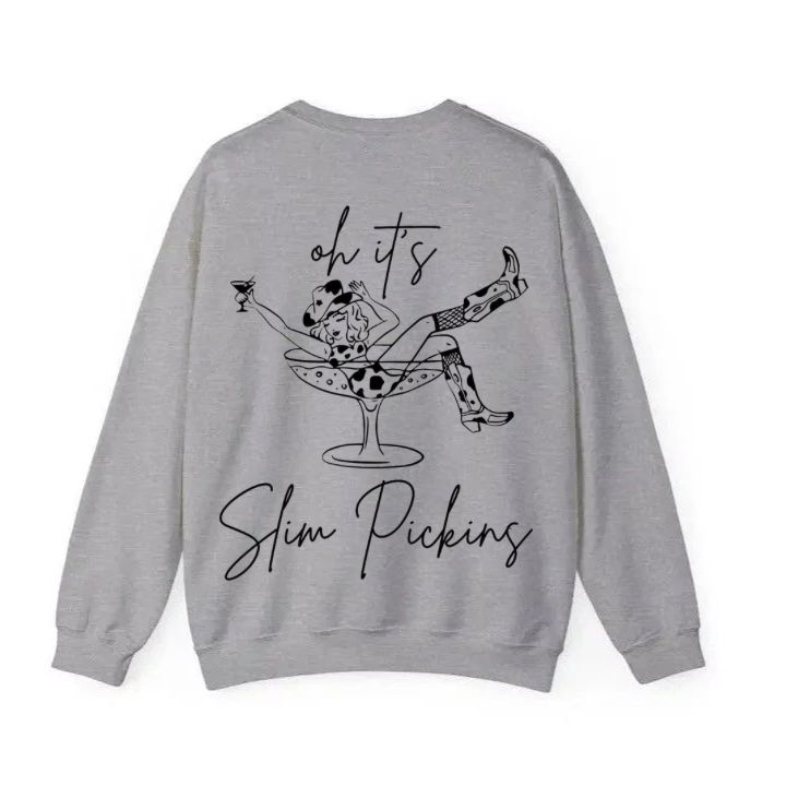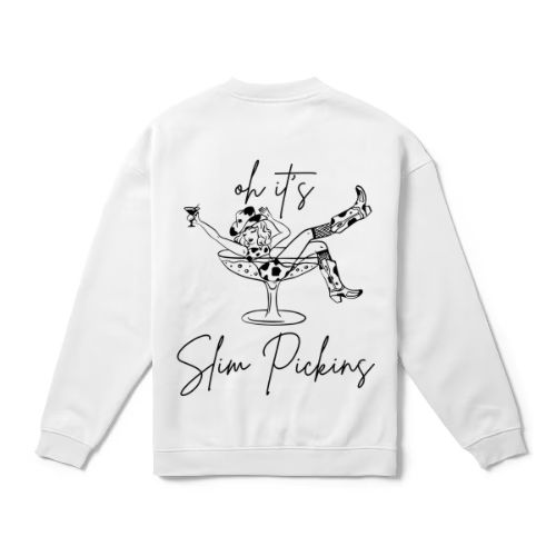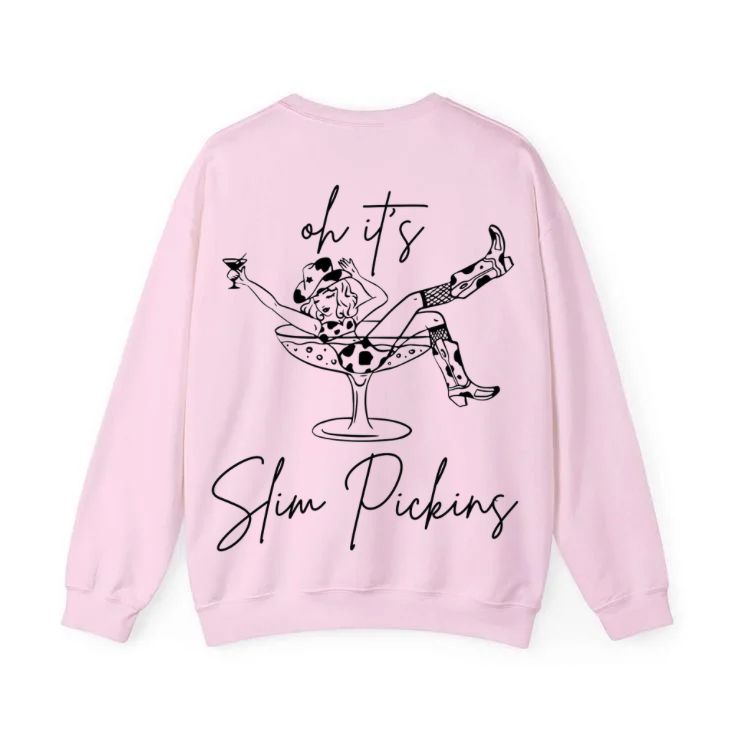 A cheeky cowgirl lounges in a martini glass beneath the playful phrase 'Oh it's Slim Pickins.' Flirty, fun, and dripping in retro pin-up attitude.