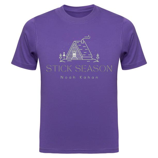 Inspired by folk simplicity, this soft-toned design features a cozy A-frame cabin surrounded by trees and snowflakes. Below, the phrase “Stick Season – Noah Kahan” anchors the look with a nostalgic lyrical nod.