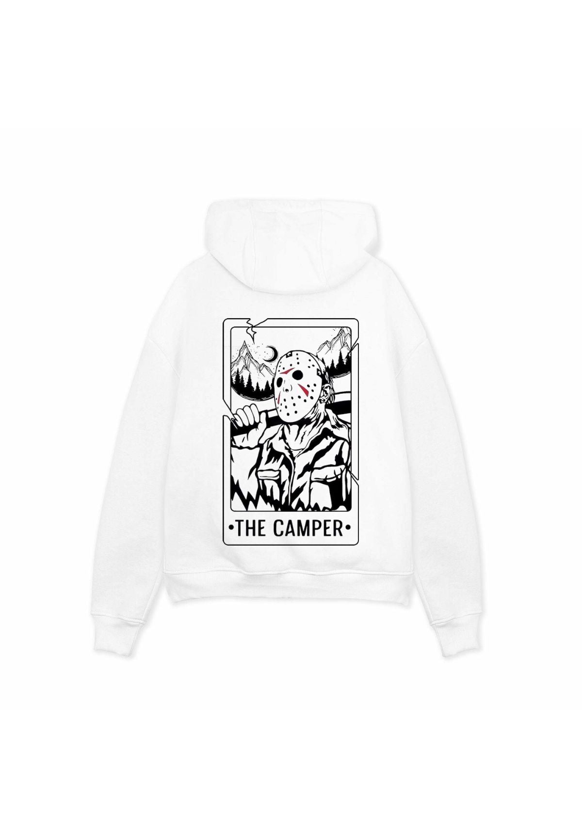 This look features a striking graphic inspired by the iconic horror movie Friday the 13th. The design showcases Jason in a hockey mask, holding a cleaver, set against a backdrop of mountains and a moonlit sky. The text "THE CAMPER" is prominently displayed, evoking a sense of chilling wilderness adventure. Crafted for comfort and style, this look is a must-have for fans of horror and unique graphic apparel.