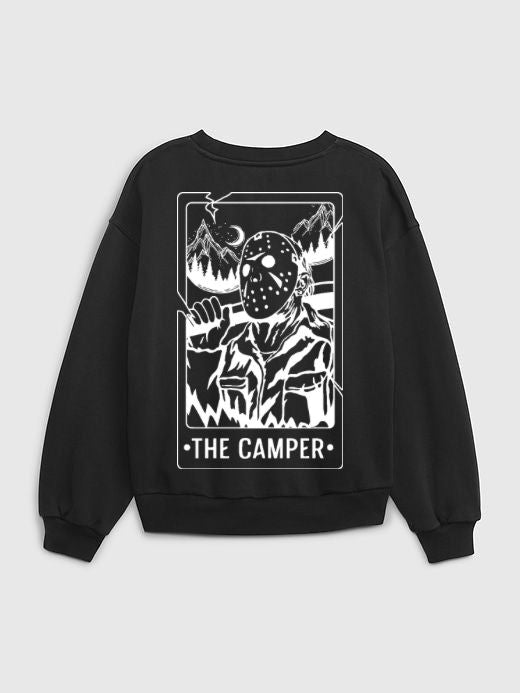 This look features a striking graphic inspired by the iconic horror movie Friday the 13th. The design showcases Jason in a hockey mask, holding a cleaver, set against a backdrop of mountains and a moonlit sky. The text "THE CAMPER" is prominently displayed, evoking a sense of chilling wilderness adventure. Crafted for comfort and style, this look is a must-have for fans of horror and unique graphic apparel.