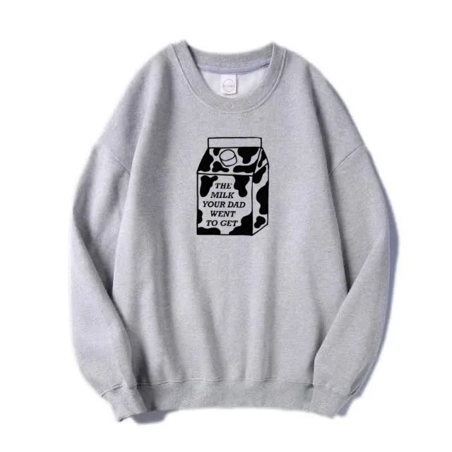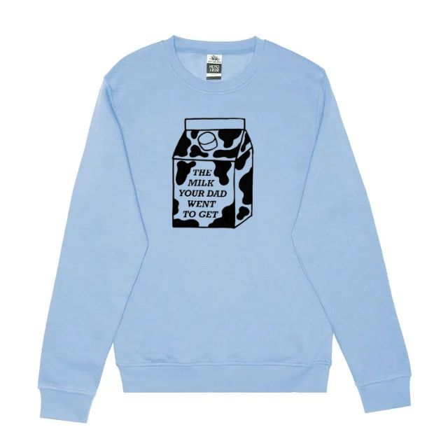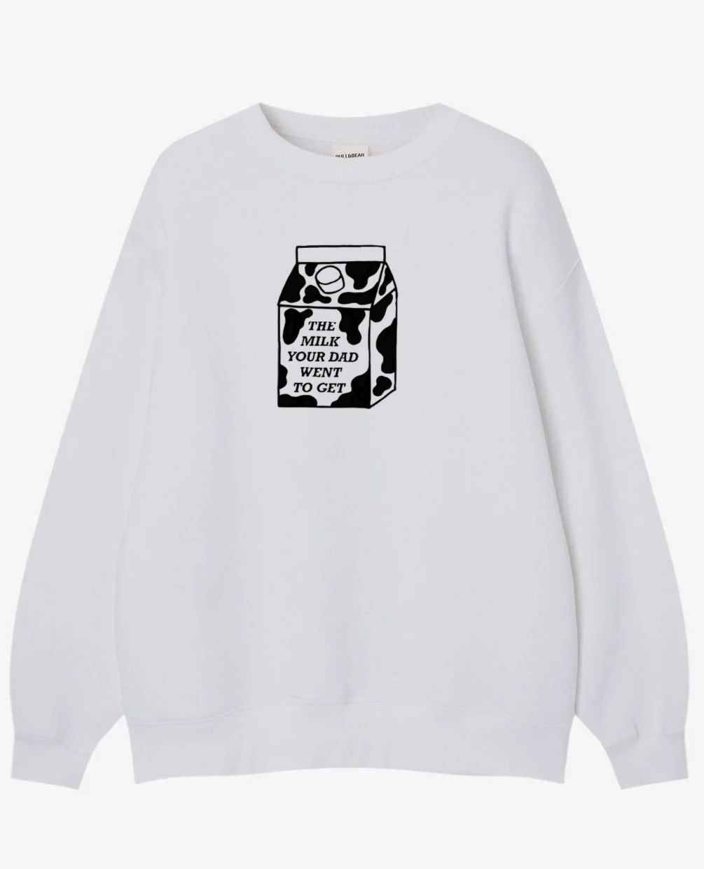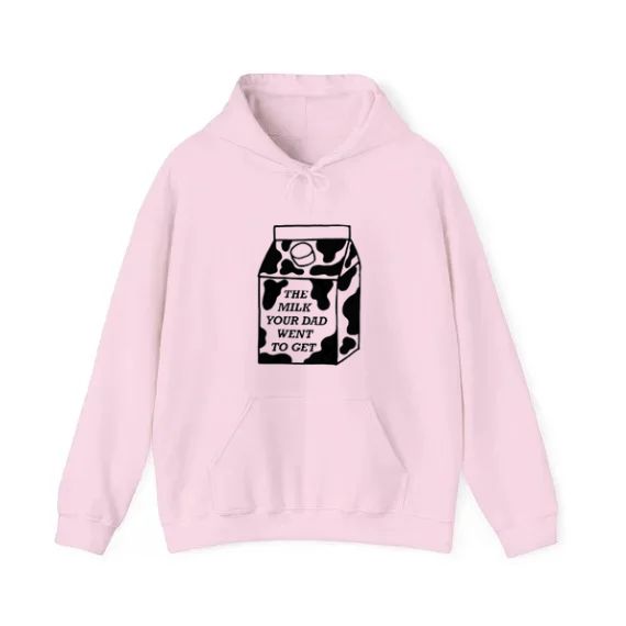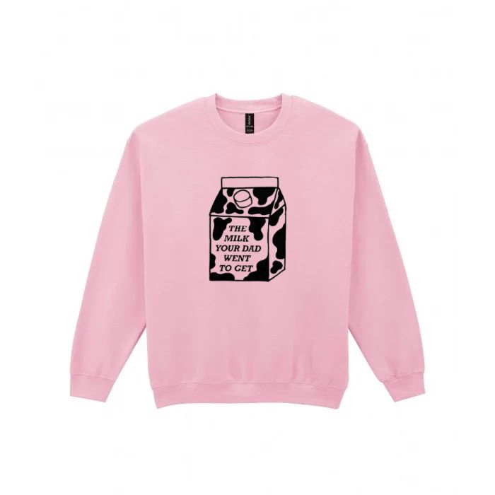 This look is a must-have for anyone with a classic sense of humour and a love for pop-culture-inspired style. The front features a bold graphic of a traditional milk carton. Inside the carton, the text reads: "THE MILK YOUR DAD WENT TO GET."